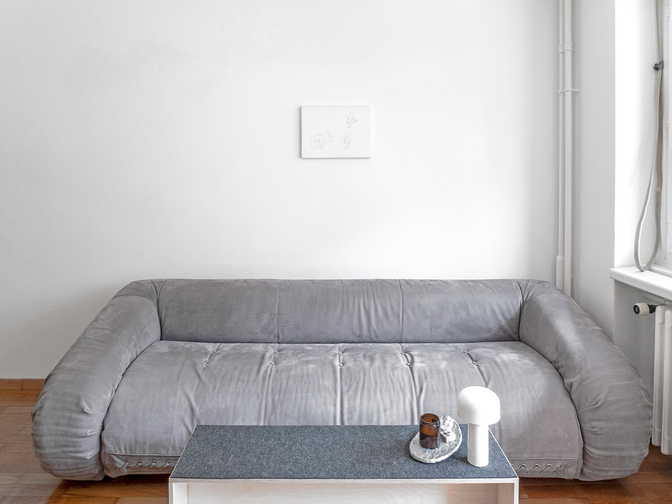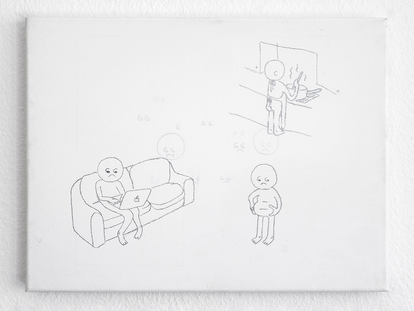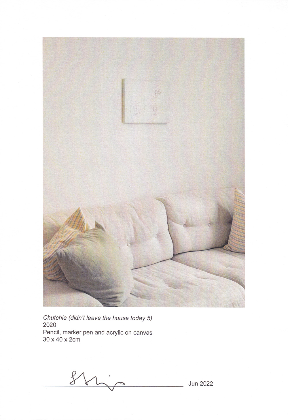 Chutchie (didn't leave the house today 5), 2020 Pencil, marker pen, and acrylic on canvas 30 x 40 x 2 cm.